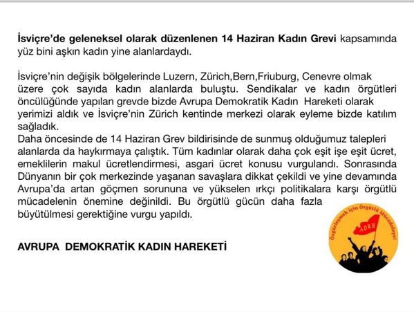 Tüm demokratik kitle örgütlerini, kadın kurumlarını ses vermeye, zalime karşı birlik olmaya çağırıyoruz. Yereller de yapılacak olan Avrupa Demokratik Güç Birliği’nin ve yine 15 Mart'taAlevi Federasyonun çağrısıyla Köln de yapılacak olan mitingleri destekliyoruz.