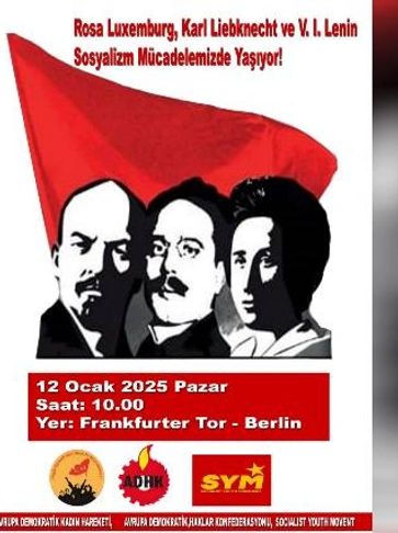 15 Ocak 1919’da, Berlin’de Alman Komünist Partisi DKP önderlerinden Rosa Luxemburg ve Karl Liebknecht Alman burjuvazisi tarafından katledildi. Yine, uluslararası işçi sınıfının ölümsüz ustalarından Lenin Ocak ayı içerisinde yaşamını yitirdi. Dünya Komünist Hareketinin yetiştirdiği sayılı komünist önderlerden olan Rosa Luxemburg ile yoldaşı Karl Liebknecht’in ve Lenin’in anısına her yıl Ocak ayının ikinci haftasında Berlin’de onbinlerce kişinin katılımıyla anma ve sosyalizme sahip çıkma eylemi düzenleniyor. Ocak ayında yaşamlarını yitiren proletaryanın büyük öğretmeni Lenin ve devrim mücadelesinin yapı taşlarından olan Liebknecht ve Luxemburg şahsında düzenlenen Sosyalizm Yürüyüşü; bu yıl da 12 Ocak 2025 pazar günü saat 10.00’da Berlin Frankfurter Tor sokağında başlayacaktır.