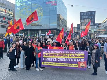 Frankfurt'ta Sosyalist ve Sosyalist feminist kadın kurumlarının organize ettiği 8 Mart'a bu yıl Ver-di ve DGB sendikasına üye kadınlar da destek sundu. Canlı ve her zamankinden daha kalabalık olan 8 Mart mitingle başladı. 8 Mart’ın tarihine ve kadın mücadelesine dair konuşmalar yapıldı. Aynı gün farklı kadın grupları değişik gösteriler de bulundular. Beyaz kanlı elbiseler giyen bir grup kadın sessiz bir kortejle kitlenin arasında yürüdüler. Kadın cinayetlerini ölen kadınların sessiz adamlarıyla duyurdular. Mitingin ardından yürüyüşe geçen kitle sık sık "yaşasın enternasyonal kadın dayanışması" faşizme karşı - Susmuyoruz, korkmuyoruz, itaat etmiyoruz. Faşizme karşı hep birlikte, paranın tahakkümüne son, dünya da yeniden barış, jin jiyan azadi sloganları sıkça atıldı. Yürüyüşün yapıldığı kalabalık caddeler de kitle de alkışlarla eşlik etti.